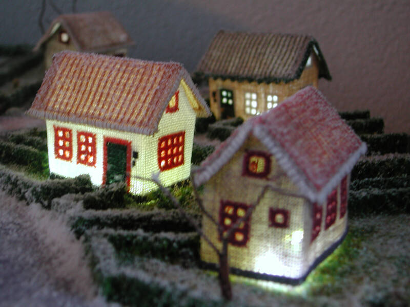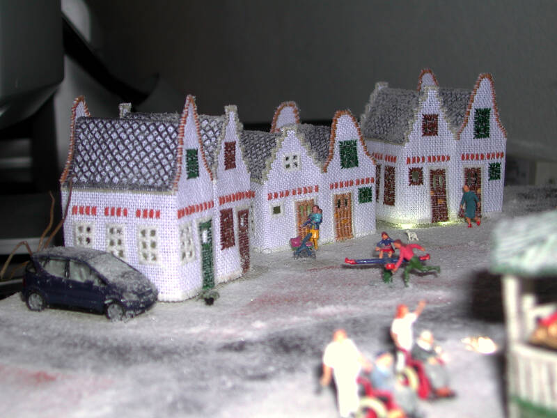 I designed this "village" for the Dutch dolls house magazine # 199. The houses, the church and the gazebo on the square are embroidered in the hardanger technique, stiffend and sewn together. Every winter we put this from the attic into our living room and enjoy it very much.