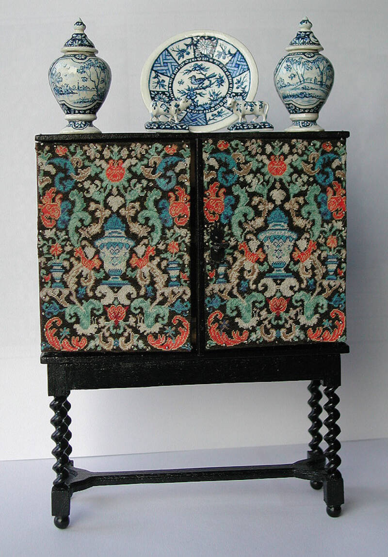 This cabinet, with embroidered sides and doors is